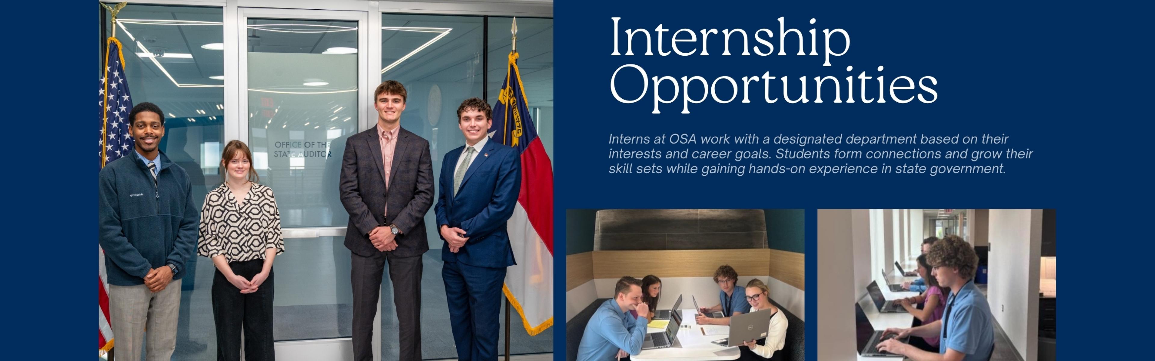 Come gain valuable experience as a North Carolina Office of the State Auditor Intern! We have several internship opportunities for college students interested in a variety of career fields. All OSA internships are paid and located at our main office in Raleigh or at one of our regional offices in Asheville, Charlotte, Greenville, Kernersville, or Wilmington.