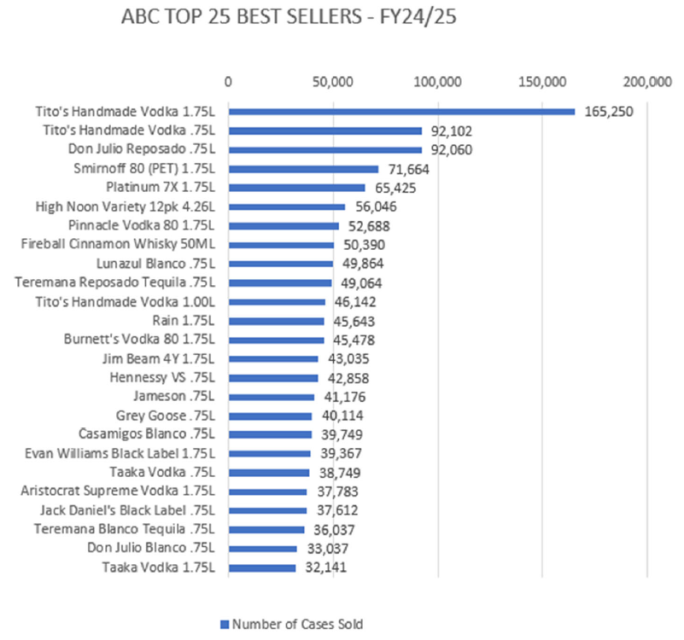 ABC “Best Sellers” data shows that North Carolinians buy Tito’s Handmade Vodka far more than any other product sold in ABC stores. In SFY 2024 and SFY 2025, Tito’s sold more than 300,000 cases of varying sizes—well ahead of any other brand or spirit type.
